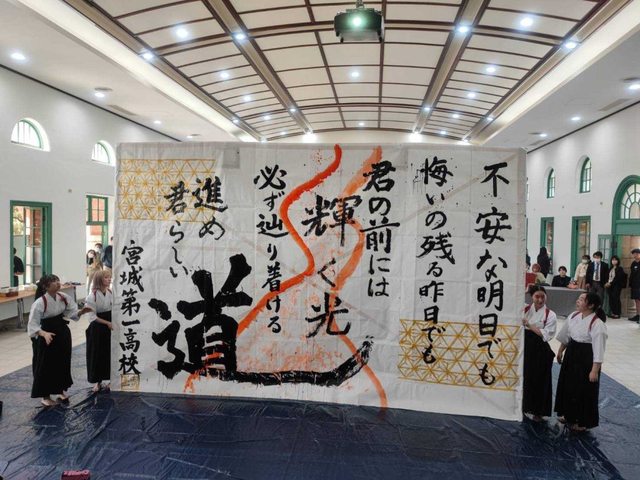 書法作品,震撼全場。除了各顯技藝,宮城一高學生也加入