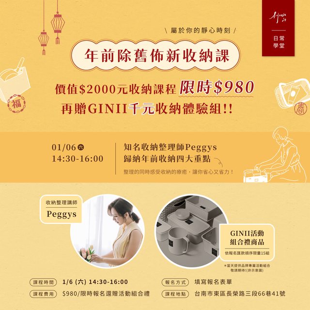 和知名收納師Peggys以及台南在地品牌GINII合作開設一堂年前除舊佈新收納課!