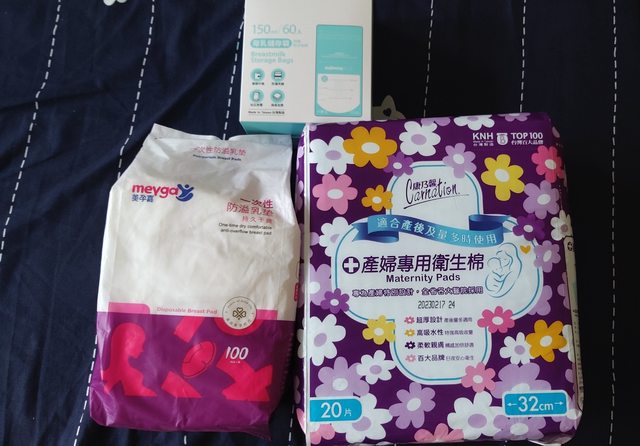 3.產褥墊、防溢乳墊、母乳儲存袋,售100元(另贈送已拆封妙而舒紙尿褲NB約15片)