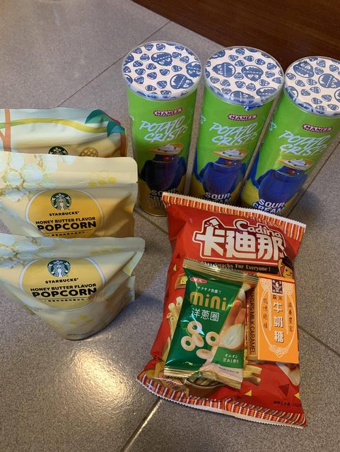有卡迪那、洋芋片、星巴克餅乾、牛奶糖