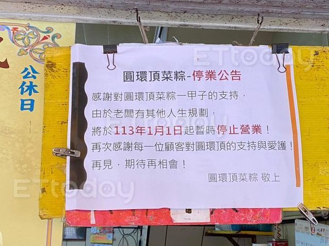 但有民眾發現,店家貼出公告,表示「感謝對圓環頂菜粽一甲子的支持,由於老闆有其他