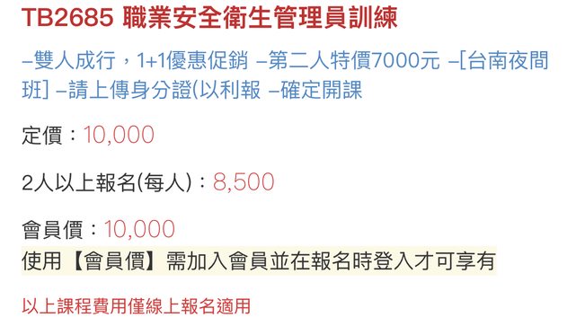 職業安全衛生管理員訓練-雙人成行,1+1優惠促銷 -第二人特價7000元 -[台南夜間班]