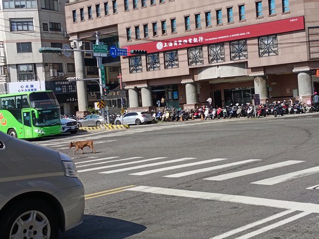狗狗不會看車,在路口跑來跑去,我停在車陣中也抓不到牠,最後看牠往忠孝路方向跑走