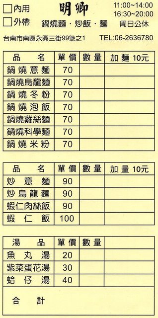 餐廳名稱:明卿炒意麵、蝦仁飯、炒烏龍麵