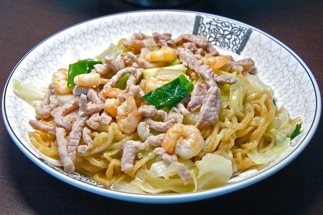 配料不複雜,就是蝦仁、肉絲、高麗菜、蔥段,跟著燙過的鍋燒意麵一起炒。