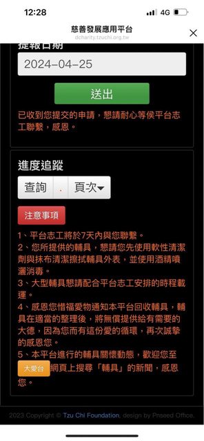 沒有在跟他們配合了)填寫回收,也把之前從版友拿到的輪椅一同給慈濟回收走,因此想