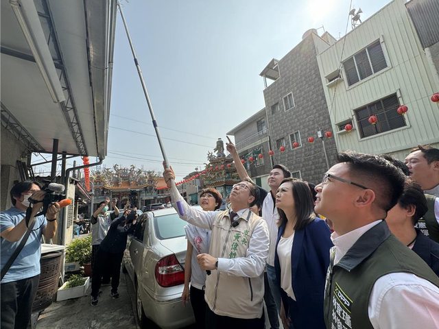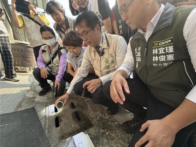 黃偉哲(右二)檢查水溝是否有孑孓並投藥。(曹婷婷攝)