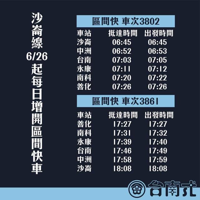 → Tatsuko: 市區以北的沙崙線班次很少,雖然說解法是搭到台南轉乘 05/10 13:57