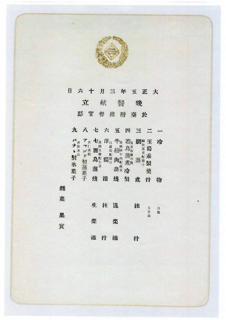 1916年、大正五年的菜單中可以看見「七面鳥」、「洋獨活」,菜單上方有燙金的「台字