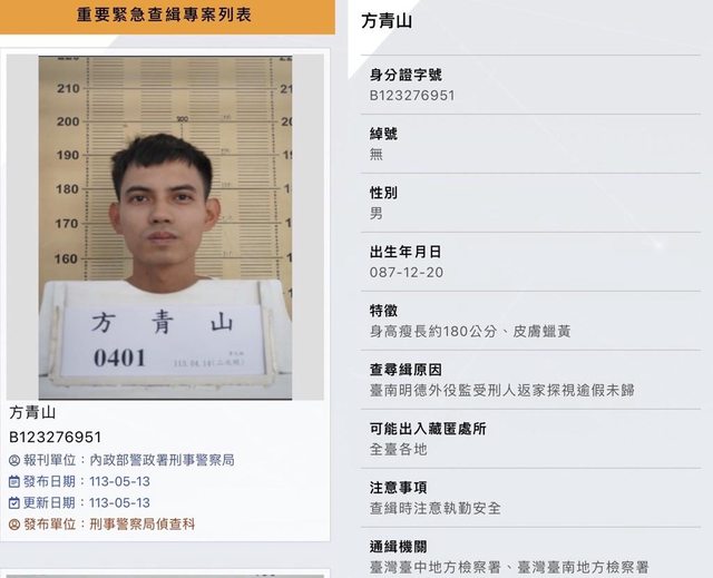台南又有要犯跑了!台南明德外役監26歲受刑人方青山,返家探視逾假未歸,稍早刑事局