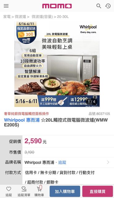 型號:Whirlpool 惠而浦 ☆20L觸控式微電腦微波爐(WMWE200S)