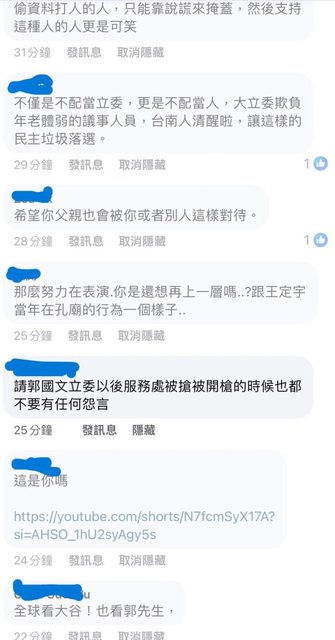 其中還有人留言「請郭國文立委以後服處被搶被開槍的時候