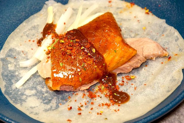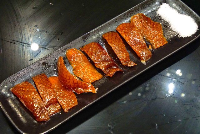 片好的鴨皮可以沾上冰晶砂糖,酥脆的口感與鴨皮的油脂在口中交融,甜而不膩。不過,