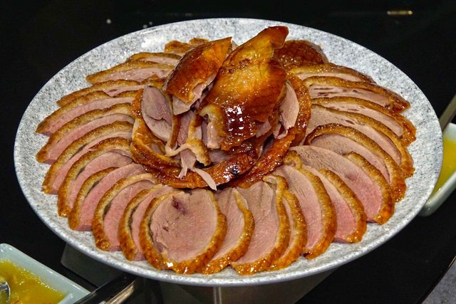 烤鴨上桌,雖然選用了2.6KG的花東縱谷放養櫻桃鴨,但比起晶英酒店的3.5KG鴨明顯地小