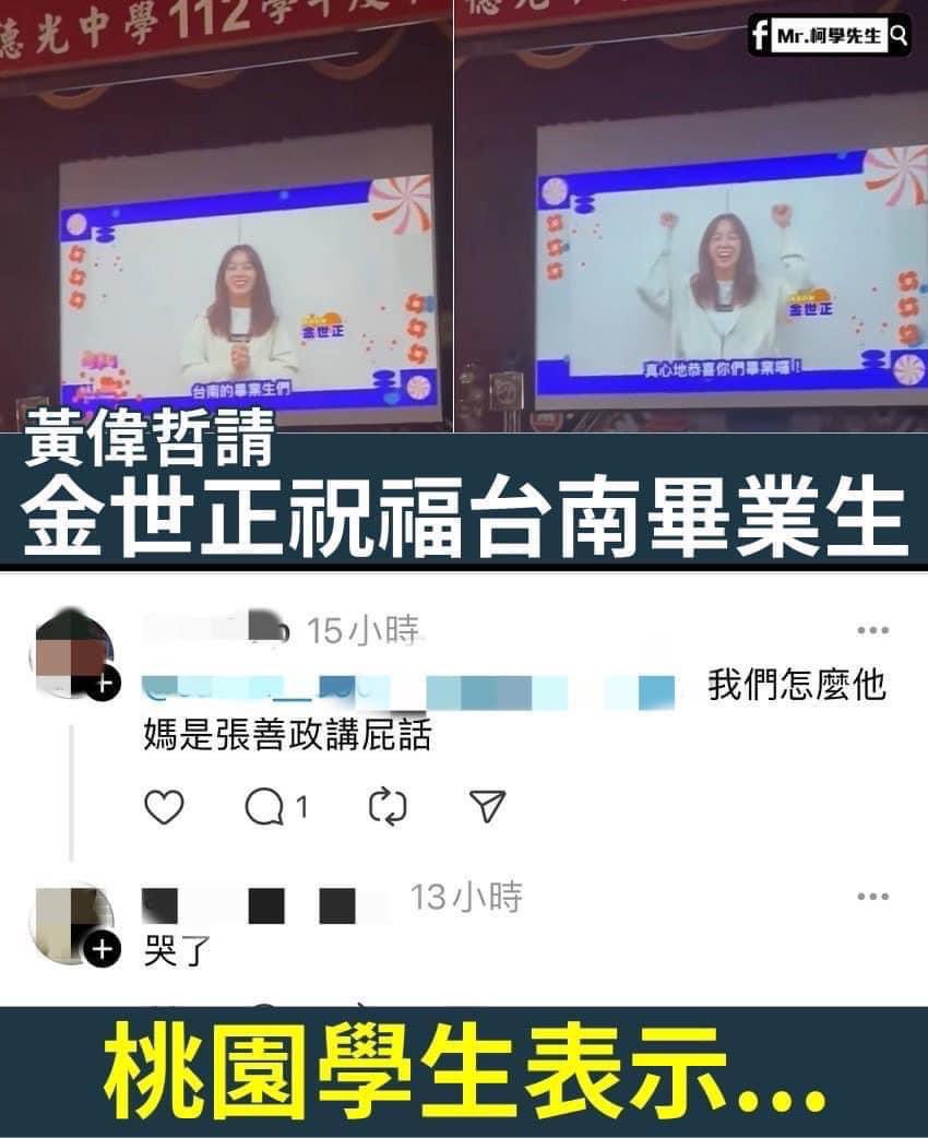 台南市德光中學昨天舉行畢業典禮過程中,投影螢幕突然出現金世正的祝福「大家好,我