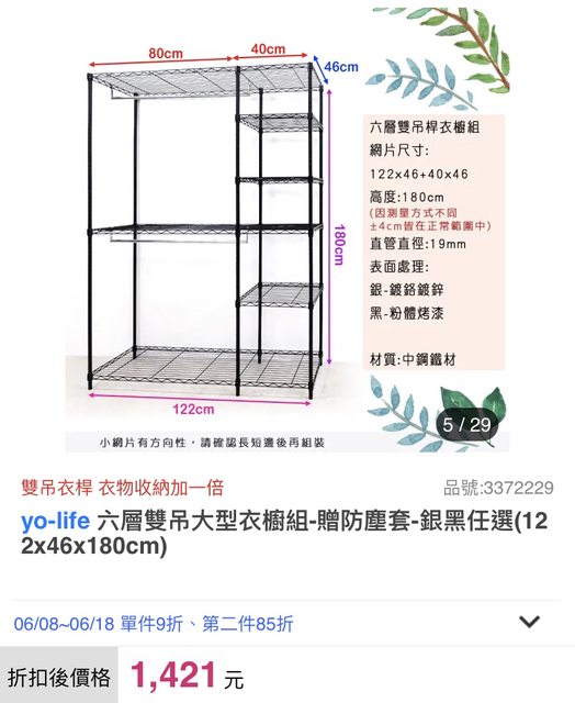 交易物品2: 銀色六層兩吊桿鐵力士衣架 約46*122*180cm