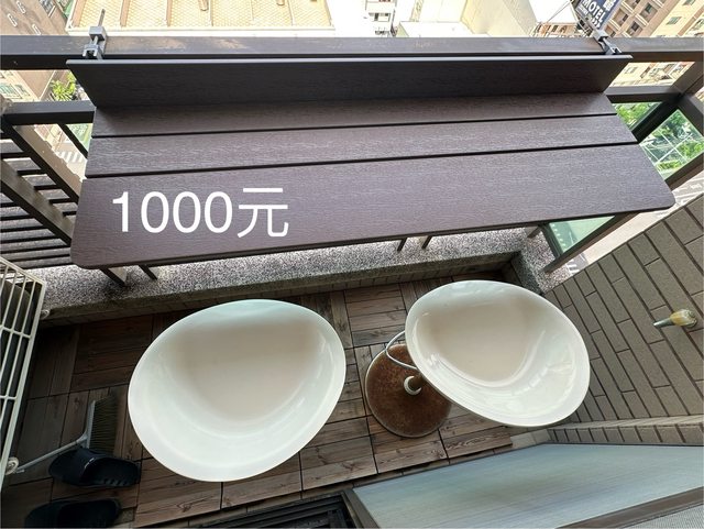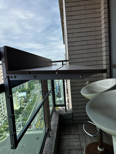 2. 陽台桌(懸掛小吧台),四段升降,照片中16塊舊的拼裝式木地板如有需要可贈送 長寬120*38,1000元