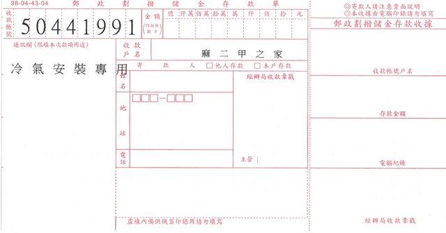 : 但在劃撥單上註明 冷氣維修安裝專用