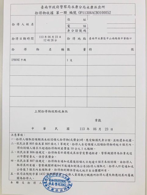 標題[失蹤] 永康中山南路拾獲 iphone 一支