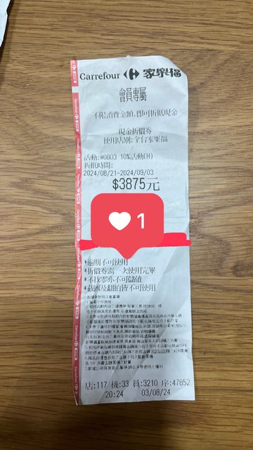 商品名稱:家樂福現金折價券 面額3875元