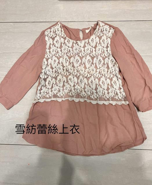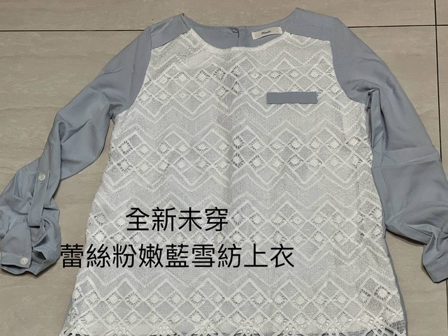 1.全新未穿-蕾絲粉嫩藍雪紡上衣 (蕾絲材質很不錯、有袖扣可捲袖) $90