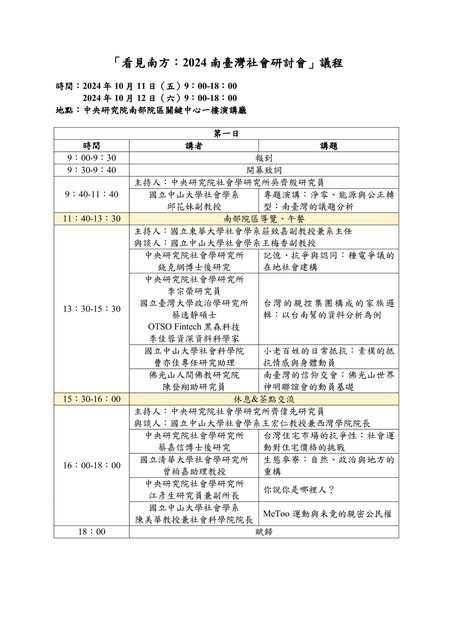 【主辦單位】 中央研究院社會學研究所「南臺灣區域社會」主題研究小組