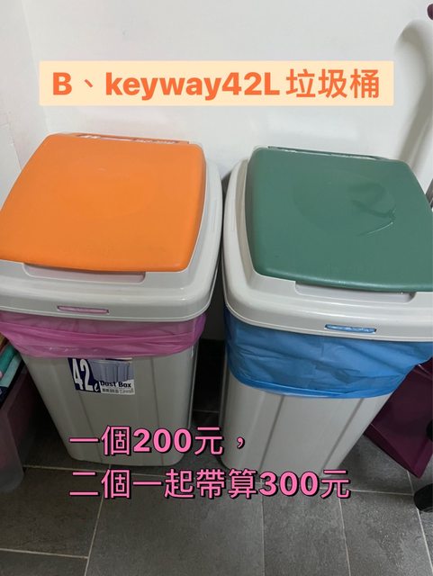B、【Keyway 42L垃圾桶】七成新/橘蓋綠蓋各一,一個售200元,二個一起帶算300元。