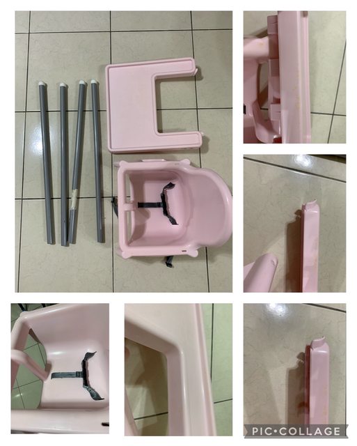 有桌面、安全帶、功能正常,每天都會清洗,有使用痕跡: 有水痕、桌面有傷痕跟染色(