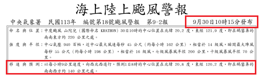 推 SinPerson: 星期一宣布時的預報都是1號下午暴風圈觸陸,現在有放半 10/03 21:38