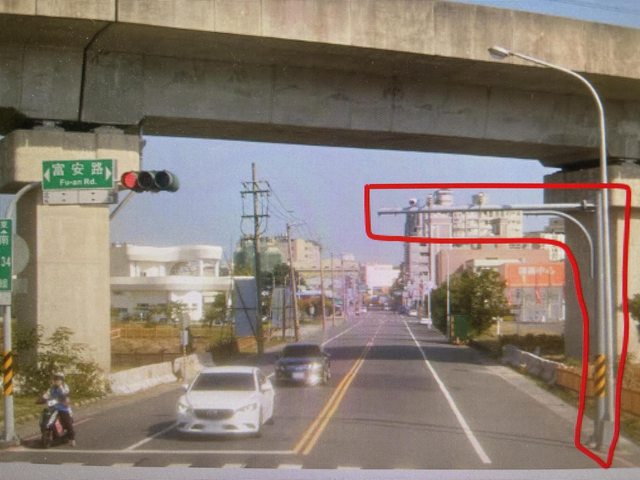 早上約八點十五分,一台載設備的大貨車經過新市消防隊的路口,高度已經超過道路監視器,還是給他硬嚕過去,當下看到那根鐵管搖晃明顯,就近一看那根鐵管已經歪了