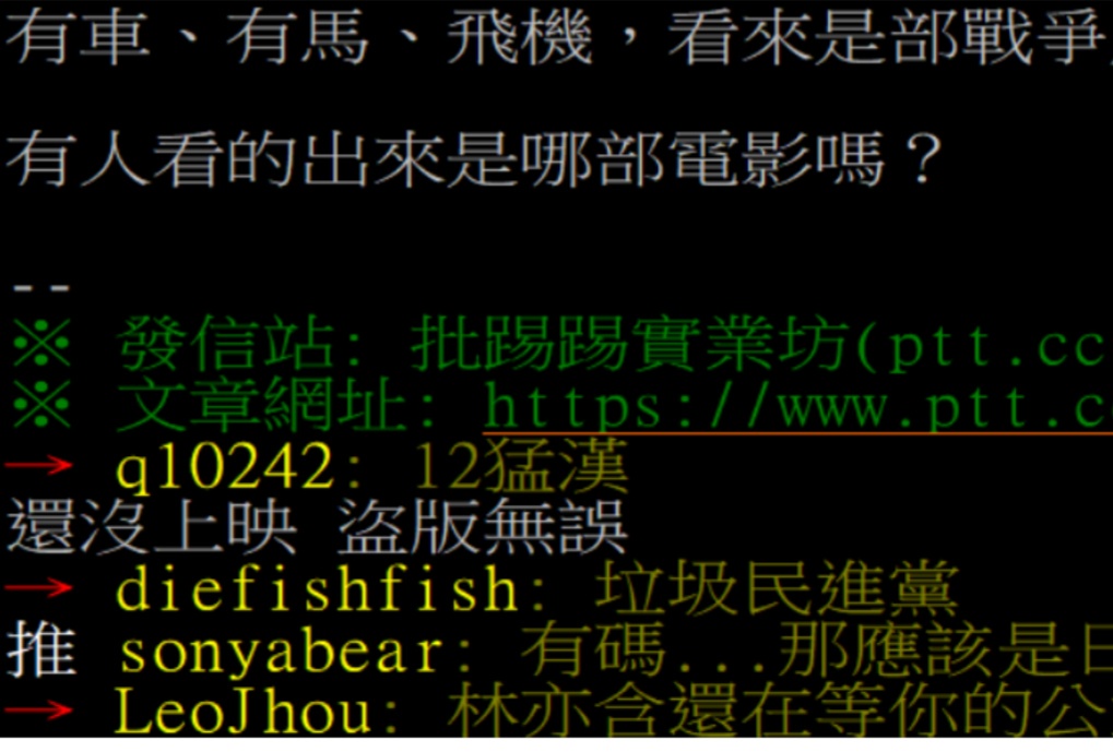 → starjim: 影片,推文說12猛漢,照當時來說若是12猛漢的話盜版無誤 10/28 17:16