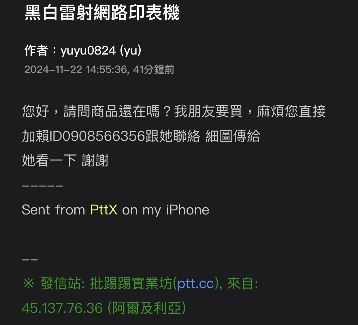 → kamato319: 我也收到,叫我寄貨到付款到宜蘭給他!都發在台南版了 11/22 21:46