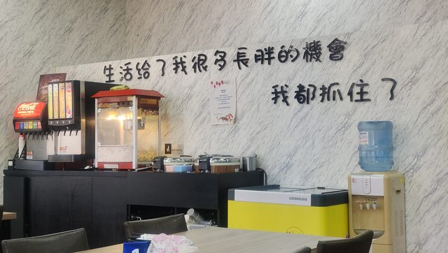 邊則是自助區的吧台,且牆壁上寫的生活給了我很多長胖的機會