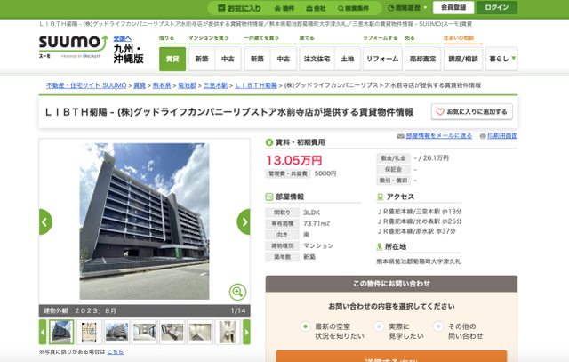 房1客廳1廚房)的格局,步行到最近的地鐵三里木站約13分鐘,每月租金要13.05萬日圓