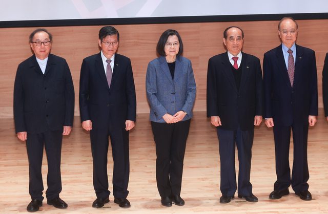 生策會昨天舉辦「2024生策年會」,蔡總統(中)出席致詞,與廣達董事長林百里(左起