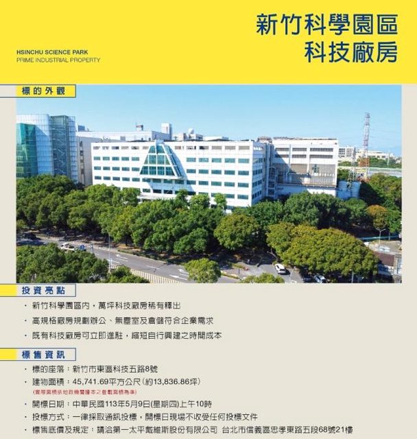 第一太平戴維斯也證實受託辦理標售作業,從官網可以看到,該廠房位於新竹市東區科技