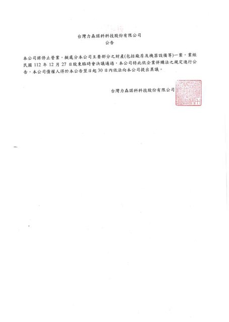 力森諾科也發布公告證實,「本公司將停止營業,擬處分本公司主要部分之財產(包括廠