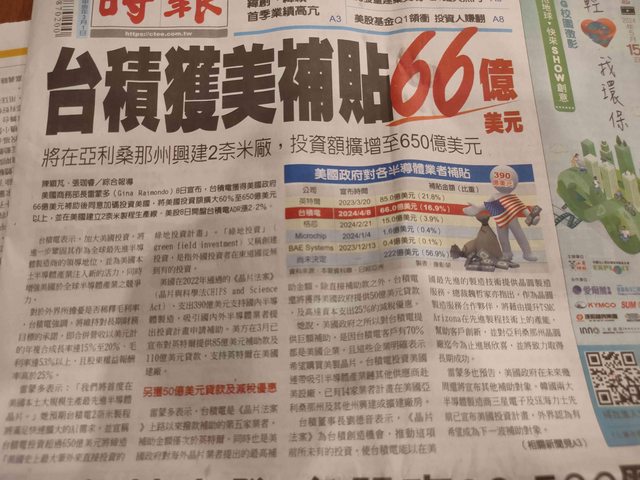 : 根據美國媒體報導,拜登政府預計將對台積電提供 66 億美元的資金補助,而台積電也承