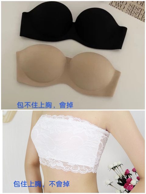 : 關於無肩帶內衣,我個人只有穿能包住上胸、有點彈性的抹胸款式才不會往下滑,