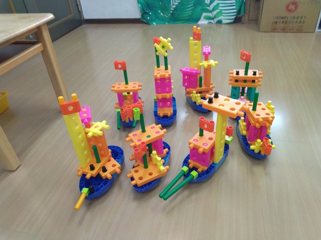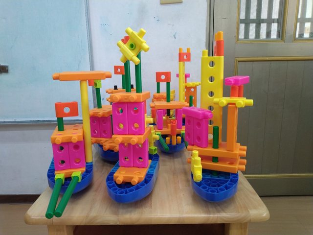 那一堂課的衍生活動,是把所有人的積木作品,放在一起集合為艦隊,再讓小朋友認其他