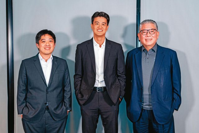 台新少主吳昕豪(中)操盤籌組自有球隊,由林祐廷(左)擔任台新育樂總經理,台新銀總