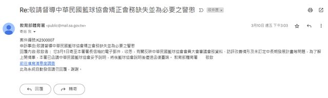 推 aee08 : 你寄給體育署他們作業流程就是轉給籃協而已,長官 09/14 15:21