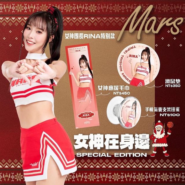 迎接12/23、24「Merry ChristMARS」聖誕週,應景推出最新「女神在身邊」主題小物,包括應援團長Rina與Taishin Wonders @taishin_wonders_official 女神們的專屬應援毛巾、滑鼠墊與手機氣囊支架扭蛋,戰友們別忘了前往戰神裝備局現場選購,讓今年聖誕有你最愛女神的甜美陪伴。