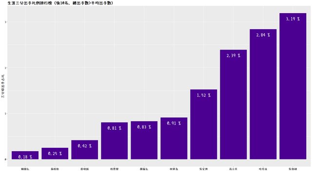 最後是生涯三分命中率的排行,這裡我提供了前十名和後十名的排行,篩選的條件為「三