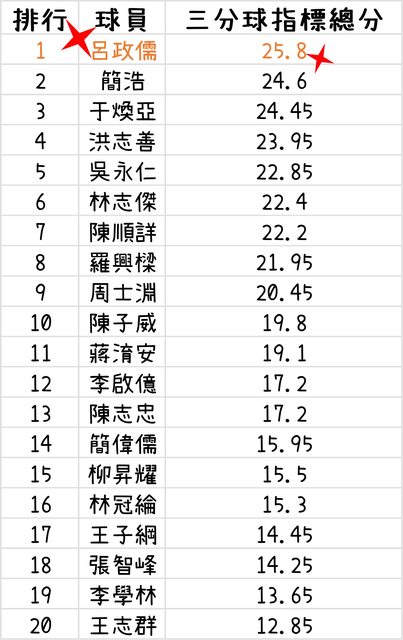 : 總分第一名是呂政儒,三分總出手數3126顆、命中數高達1105顆、生涯命中率35%,以