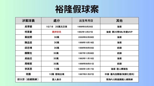 指揮刑事局4大隊兵分多路搜索,帶回9名裕隆現役球員,訊後均交保,小組頭柯旻豪則遭聲