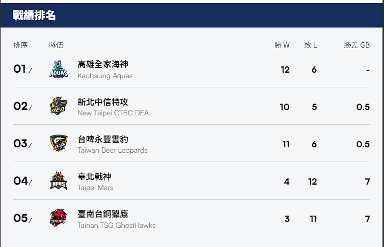 → bobwalkerkao: 序是用勝W 所以勝場數雲豹排第2 如果勝改成選敗L就 02/19 11:51