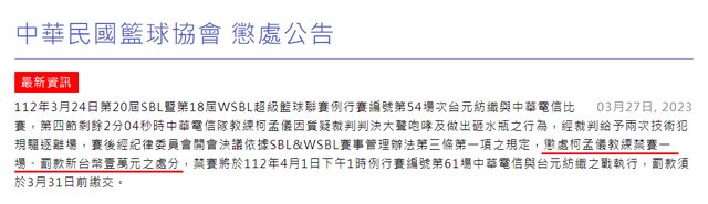 記得去年WSBL中華電信柯孟儀教練抗議裁判吹判領到禁賽1場+罰款1萬元的懲處