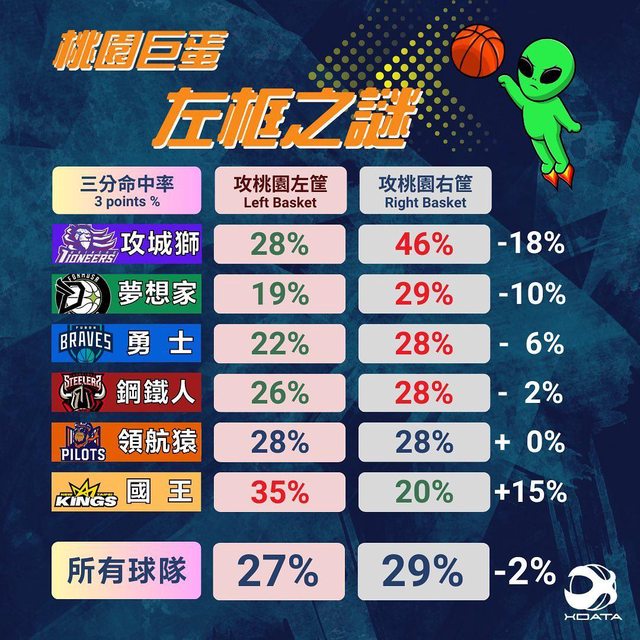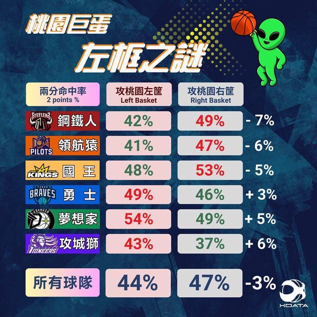 事實上經過統計,連地主領航猿在自家左框也投出了較低的兩分命中率,三分則不受影響