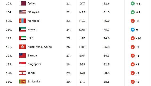 : 島上升4名,爬升至72名,而日本依舊是亞洲第一(不包含大洋洲),目前排名第26,優於